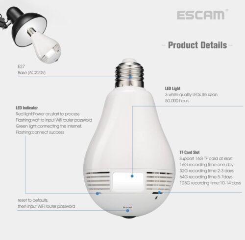 Κάμερα εσωτερικού χώρου πανοραμική 360 μοιρών που βιδώνει σε υποδοχή λάμπας Ε27 με ανάλυση 1.3Mp με υποδοχή κάρτας μνήμης για καταγραφή και 3χ1watt Led για φωτισμό